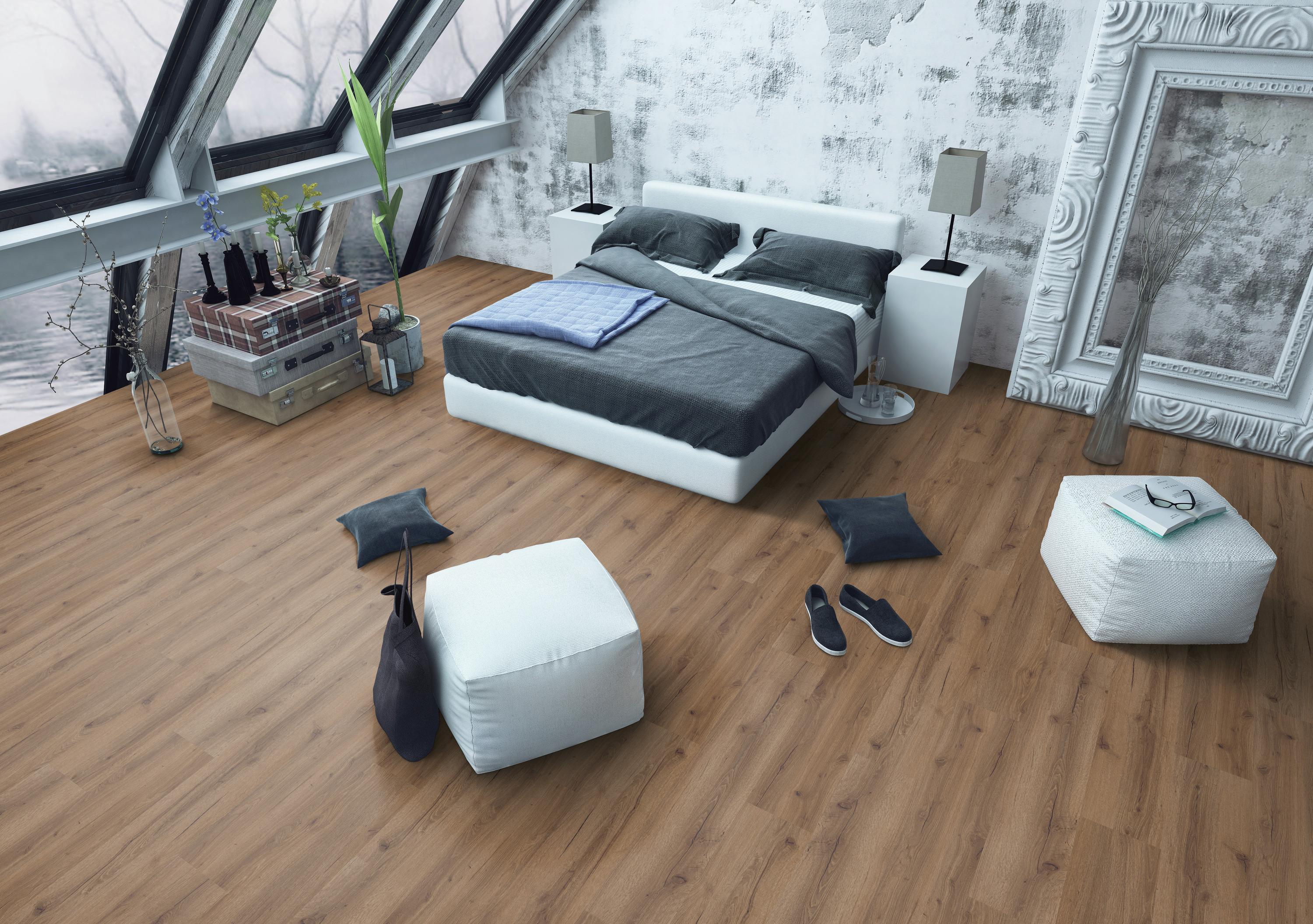 Bei diesem Vinylboden ist die Dämmung schon integriert, was die Installation erheblich vereinfacht. Die Click-Verbindung ist ein Verriegelungssystem, das sich einfach handhaben lässt: Die Dielen fügen sich mit einem Click-Effekt zuverlässig ineinander.